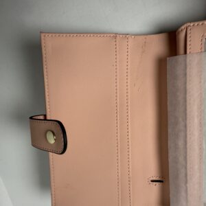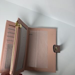 This beautifully crafted blush pink tri-fold wallet combines function and fashion with its smooth faux-leather exterior, gold-tone hardware, and secure snap closure. Inside, you’ll find multiple card slots, a clear ID window, and a zippered pocket for coins or small items. Compact enough to fit any handbag while offering plenty of space for your daily must-haves.