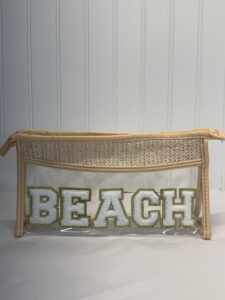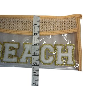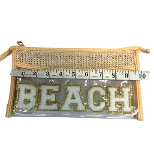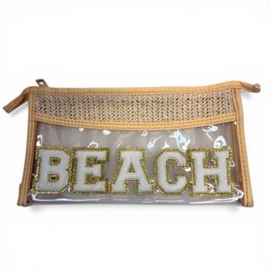 Bring coastal vibes wherever you go with this stylish clear beach makeup bag featuring a bold chenille “BEACH” patch and woven straw detail.