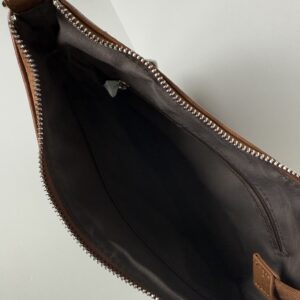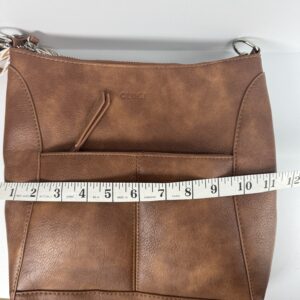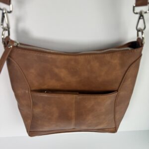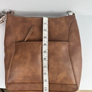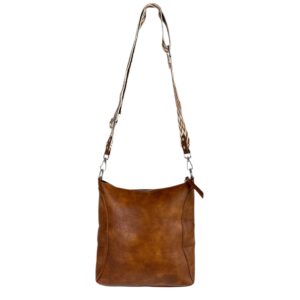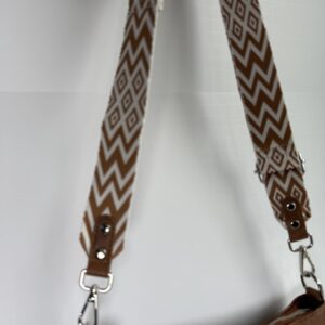Crafted in a soft, distressed brown faux leather, the bag features two front slip pockets, a full-zip main compartment, and an adjustable woven shoulder strap with a geometric design.