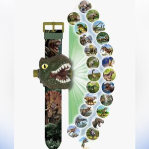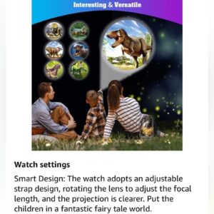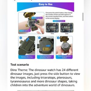 can project 24 different dinosaur patterns, with adjustable projection definition and display time and dateCool design dinosaur appearance, toys and electronic watches are integrated, and can also be used as a flashlight at night function