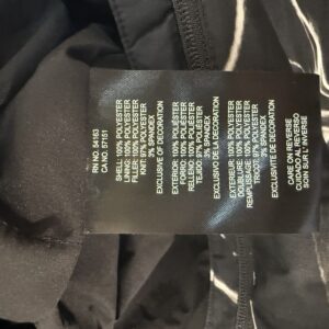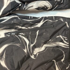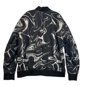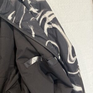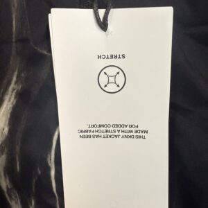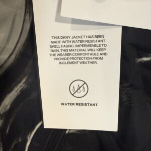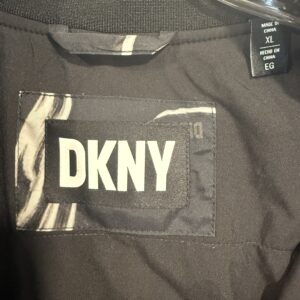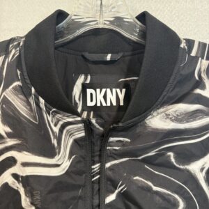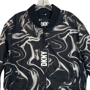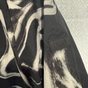This jacket features a bold black and white marble print with subtle DKNY branding throughout. Designed with a water resistant shell fabric, it helps protect against light rain while maintaining a sleek, modern look.