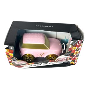 The FAO Schwarz Melrose The SUV Remote Control Car delivers a stylish, boutique-inspired RC experience for kids ages 6 and up. Featuring a glossy pink body, metallic gold roof and wheels, and a vanity-themed sticker pack, this remote-control SUV is designed for imaginative play and display.