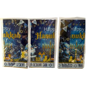 Bring festive sparkle to your Hanukkah celebration with this set of 3 rectangular plastic tablecloths, each featuring a vibrant blue holiday design with menorahs, Stars of David, dreidels, coins, and decorative gnomes.