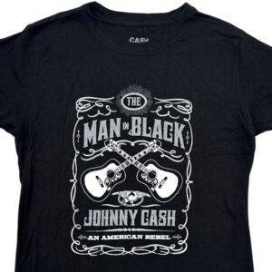 This black women’s band tee features a bold front graphic with crossed guitars and classic western-inspired typography reading “The Man in Black – Johnny Cash – An American Rebel.” A timeless design for country music fans and vintage band tee colle ‘s alike.