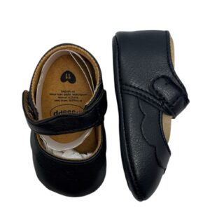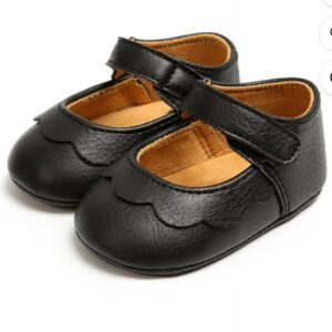 Crafted from smooth vegan leather, they feature a soft inner lining, adjustable hook-and-loop strap, and anti-slip soles for safe steps and lasting durability. Their sweet scalloped detail gives them that classic look — perfect for everything from playdates to picture days.