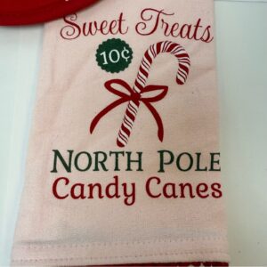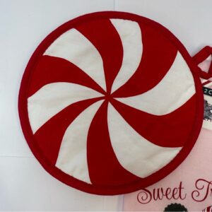 Charming pot holder with a red and white peppermint design. Comes with a pink towel featuring candy cane graphics.