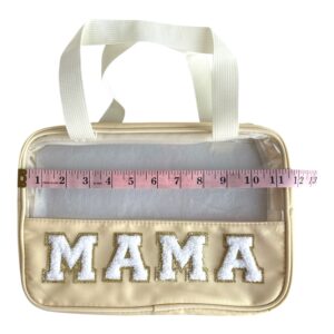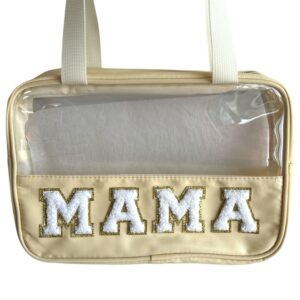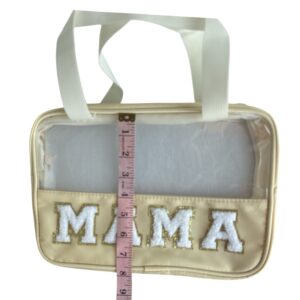Elevate your travel essentials with this preppy clear-front “MAMA” cosmetic bag. Designed with a durable nylon base and transparent PVC upper panel, this structured zipper pouch keeps your items visible while maintaining a polished look.