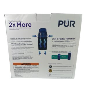 PUR’s 2-in-1 Faster Filtration Technology uses activated carbon and ion exchange materials to reduce chlorine taste and odor, certain heavy metals, and other common contaminants found in tap water.