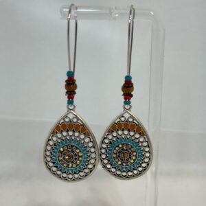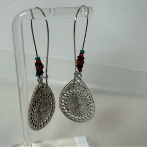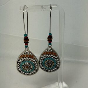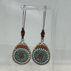 Elegant silver teardrop earrings featuring turquoise and orange brown accents.