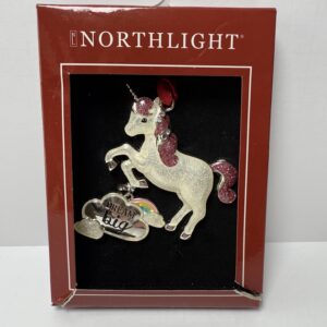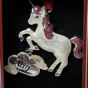 This Northlight “Dream Big” unicorn ornament adds a magical touch to any Christmas tree or holiday display. Crafted with a glittered white body, pink glitter mane and tail, and a silver-tone dangling cloud charm with rainbow detailing, it’s a standout piece for unicorn lovers and whimsical décor collectors.