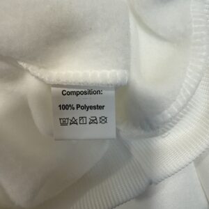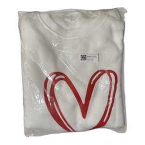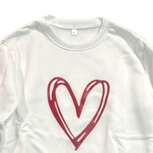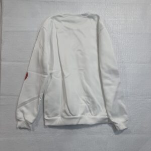 This white crewneck sweatshirt features a playful red heart graphic on the chest with matching heart accents on the sleeves, giving it a cozy yet eye-catching look. Made from soft 100% polyester, it offers lightweight warmth and a smooth feel that’s perfect for everyday wear.
